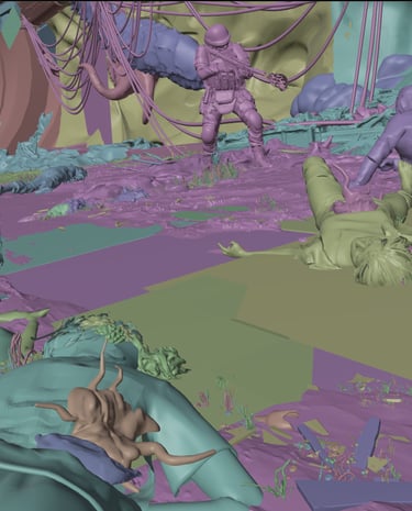 I primarily work with tools such as Blender, Photoshop, and Unreal Engine, using 3D as a foundation to inform composition, scale, and mood, followed by targeted paintover and refinement.